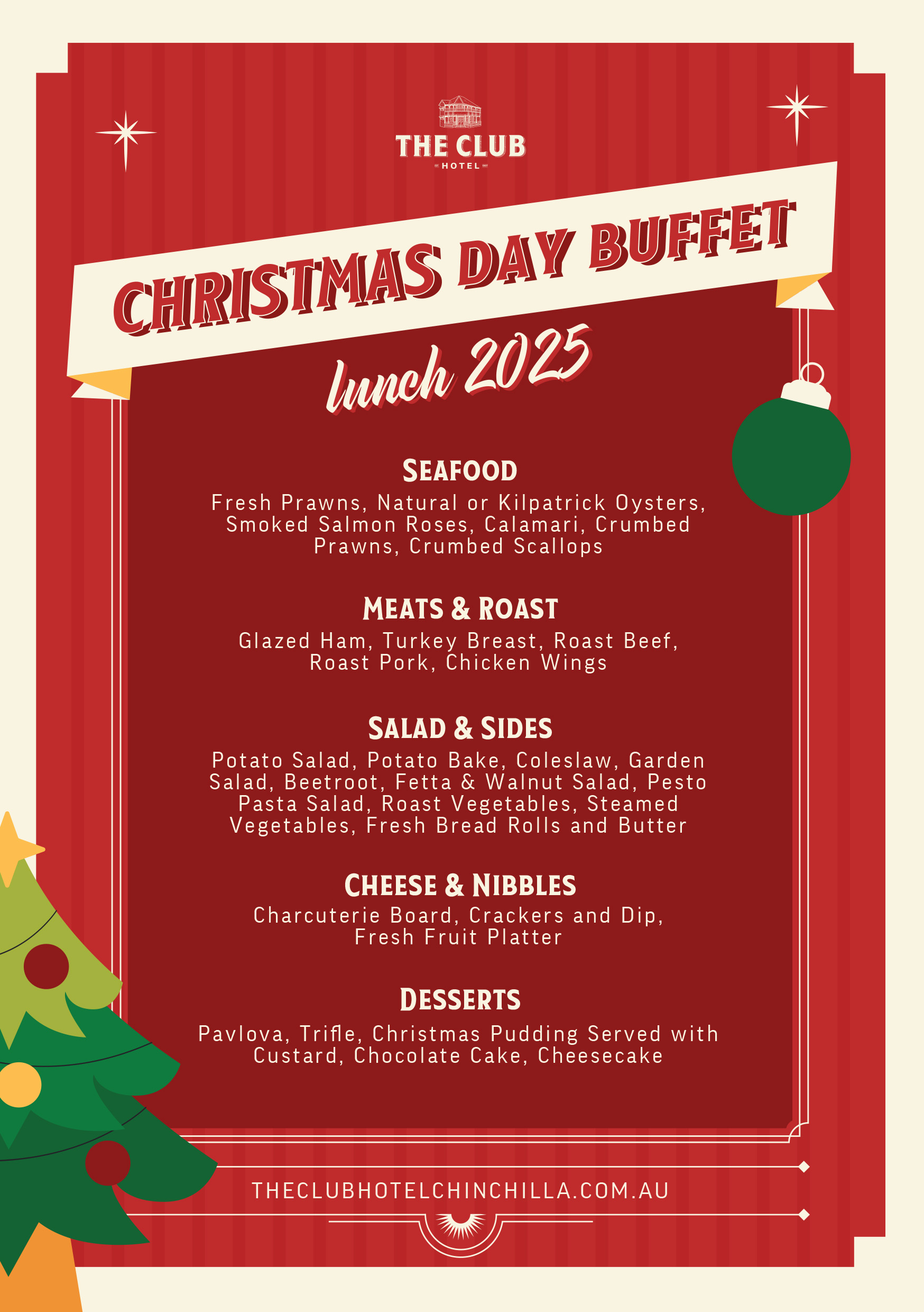 Forget the stress of holiday cooking and let us take care of everything this Christmas Day! Join us at Club Chinchilla from 11am on Thursday 25th December for a memorable Christmas Day Buffet Lunch that’s guaranteed to bring smiles all around.